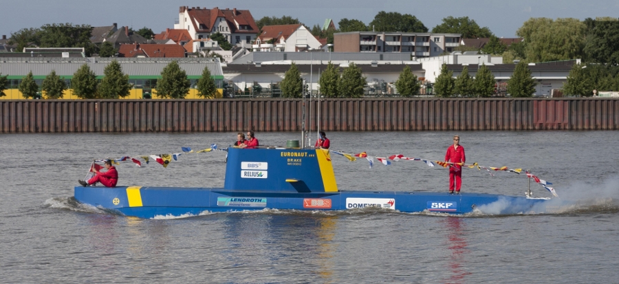 Dear friends, the first travel was on the 4th August 2012 the river up , via the town of Bremen to a lake with a entrance from the river. We make there out first two dives to a depth of about 25 feet. Small leaks, many idears to make the sub better but no bigger problems. We sail back in the night and there fore test all lamps. On sunday the 5th August we sailed from the building location to the harbour of Brake. There will be a harbour festival on the weekend 11-12 August were the sub will be on display and clear for your inspection.